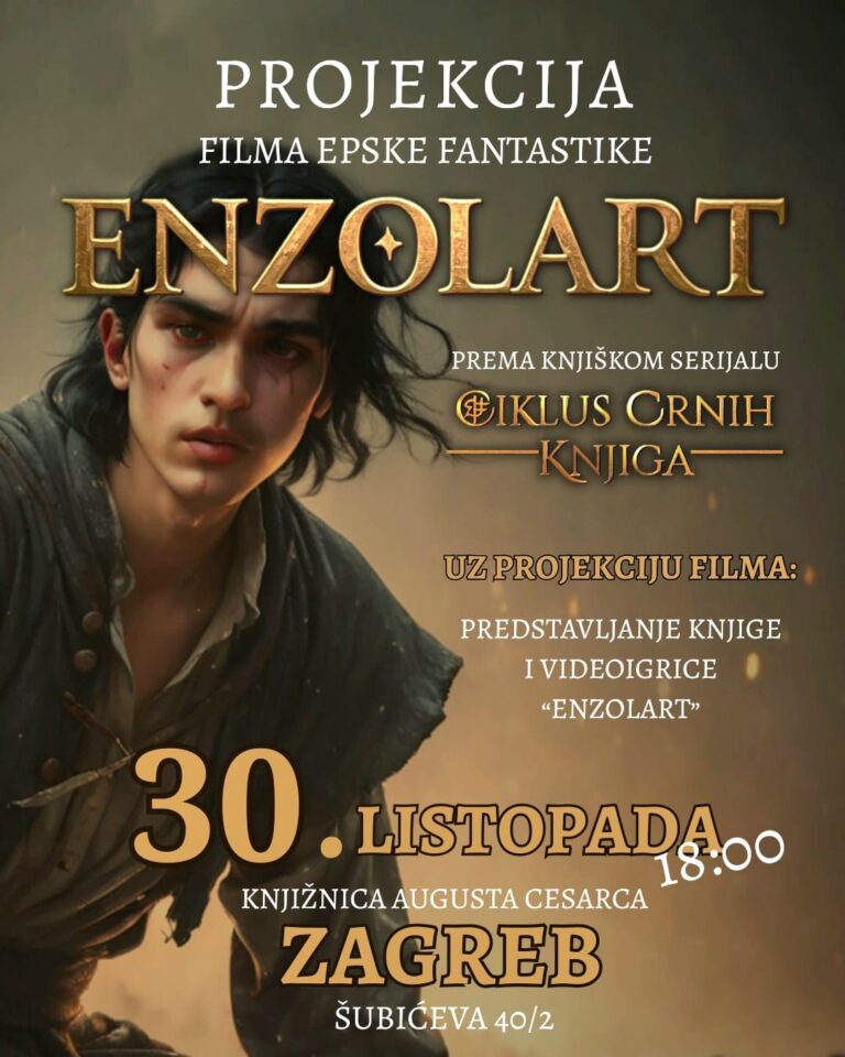 Projekcija filma Enzolart: “Knjižnica Galženica”, Velika Gorica, 18. rujna 2025., 18:00h VELIKA GORICA, 18. rujna, 18:00 sati, Knjižnica Galženica ———————— Dragi prijatelji, pozivam vas spektakl epske fantastike i projekciju animiranog filma “Enzolart”, 18. rujna, u Knjižnici Galženici u Velikoj Gorici…